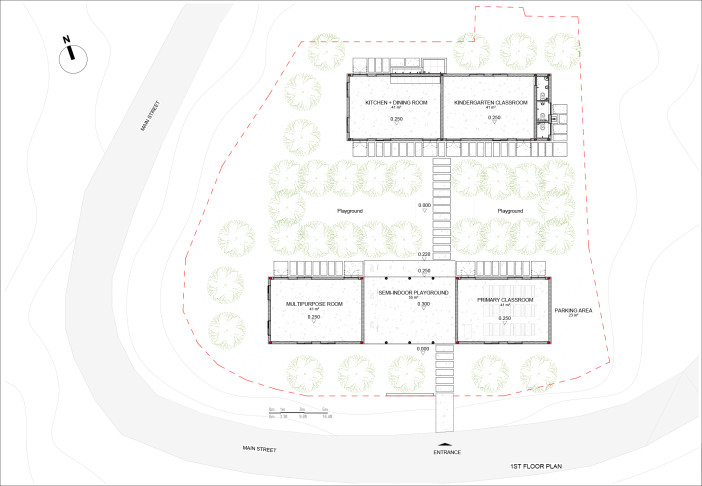 With a strong intention to preserve the existing green landscape and harmonize with nature, the classrooms and buildings are arranged to open their windows toward the surrounding forested mountains, while the central courtyard is oriented to capture a panoramic view of the valley.