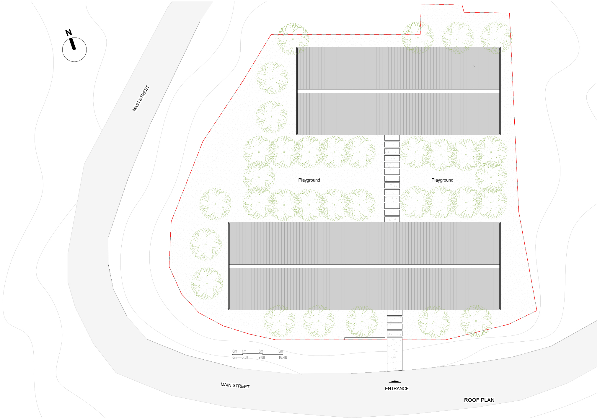 Utilizing locally available natural materials, the school is mainly constructed rammed earth walls and bamboo roofing. The use of earth and bamboo not only reduces transportation costs and environmental impact, but also fosters both physical and spiritual connections with the local context. The structure is designed to be simple yet robust, appropriate for the sloped terrain and resilient to the area^s heavy rainfall.