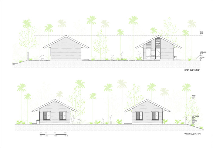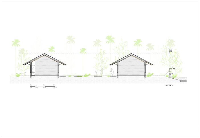 Tận dụng vật liệu tự nhiên sẵn có tại chỗ, công trình được xây dựng chủ yếu bằng tường đất nện và mái kết hợp tre. Việc sử dụng đất và tre không chỉ làm giảm chi phí vận chuyển và tác động môi trường, mà còn tạo nên sự kết nối vật chất và tinh thần với bối cảnh địa phương. Kết cấu của công trình được thiết kế đơn giản nhưng chắc chắn, phù hợp với vị trí nền đất sườn đồi và có khả năng chống chịu tốt với điều kiện thời tiết mưa nhiều.